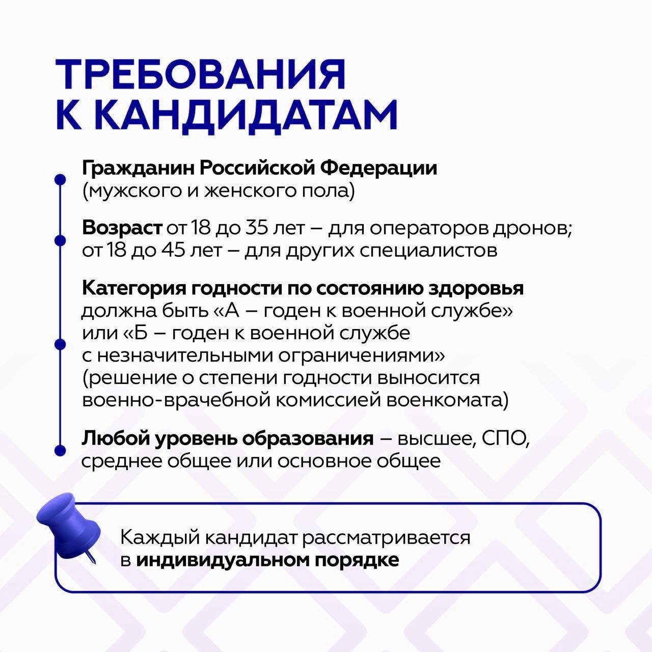 Весь срок службы проходит исключительно в подразделениях войск беспилотных систем с обязательным курсом обучения управлению дронами различного типа и выплатами. По истечении срока контракта и при нежелании заключить новый — гарантированное увольнение.