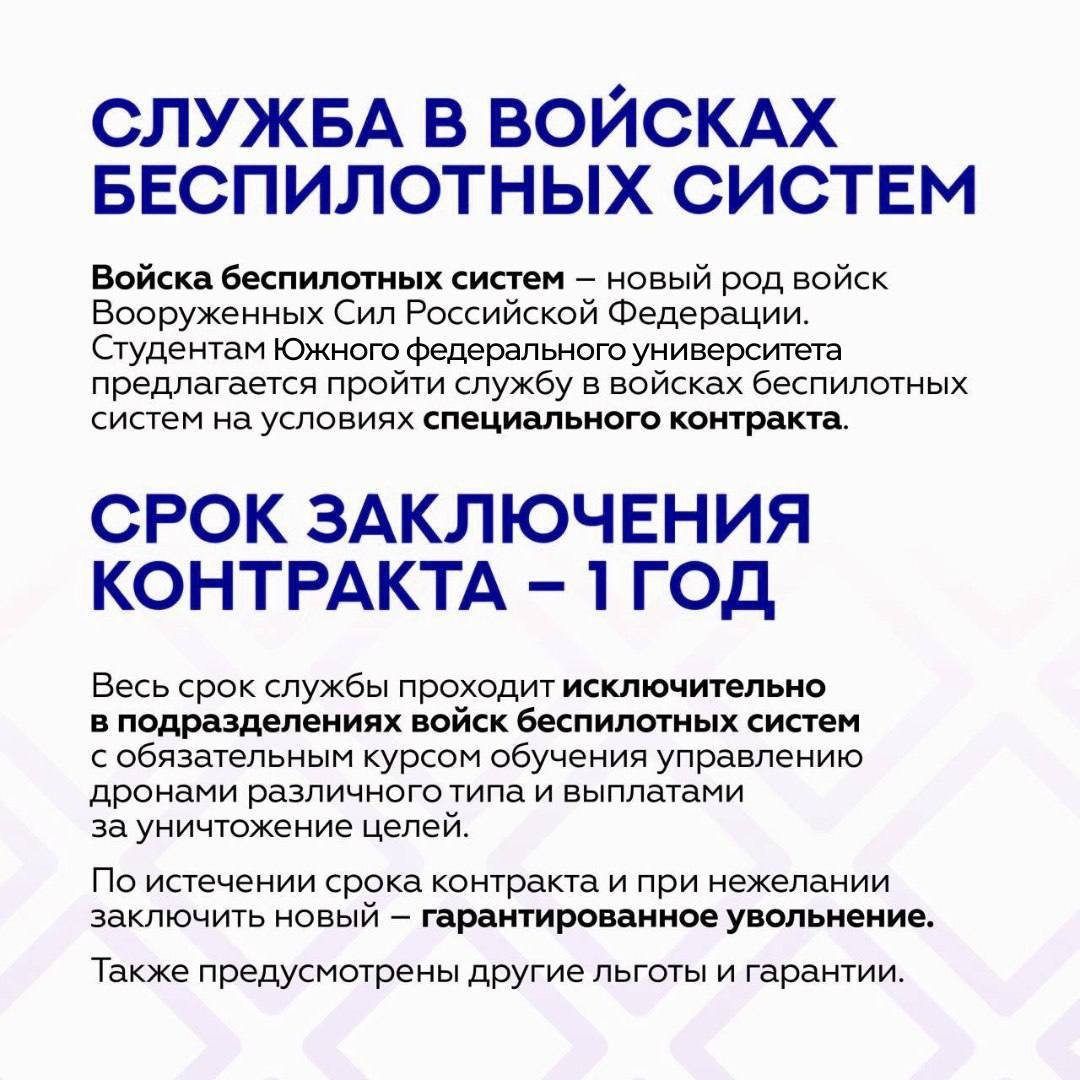Войска беспилотных систем — новый род войск в Вооруженных Силах Российской Федерации. Студентам Южного федерального университета предлагается пройти службу в войсках беспилотных систем на условиях специального контракта на один год.