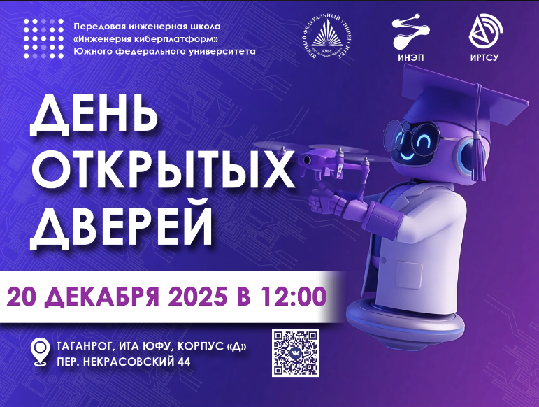 Передавая инженерная школа Южного федерального университета «Инженерия киберплатформ», Институт нанотехнологий, электроники и приборостроения Южного федерального университета приглашает на День открытых дверей «ЭЛЕКТРОНИКА И НАНОИНЖЕНЕРИЯ» учащихся 8-11 классов и выпускников средних специальных образовательных учреждений, родителей, учителей и всех заинтересованных 19 апреля 2025 года в 13.00 по адресу: г. Таганрог, ул. Шевченко, д. 2, Точка кипения ИТА ЮФУ. Начало регистрации в 12.30.